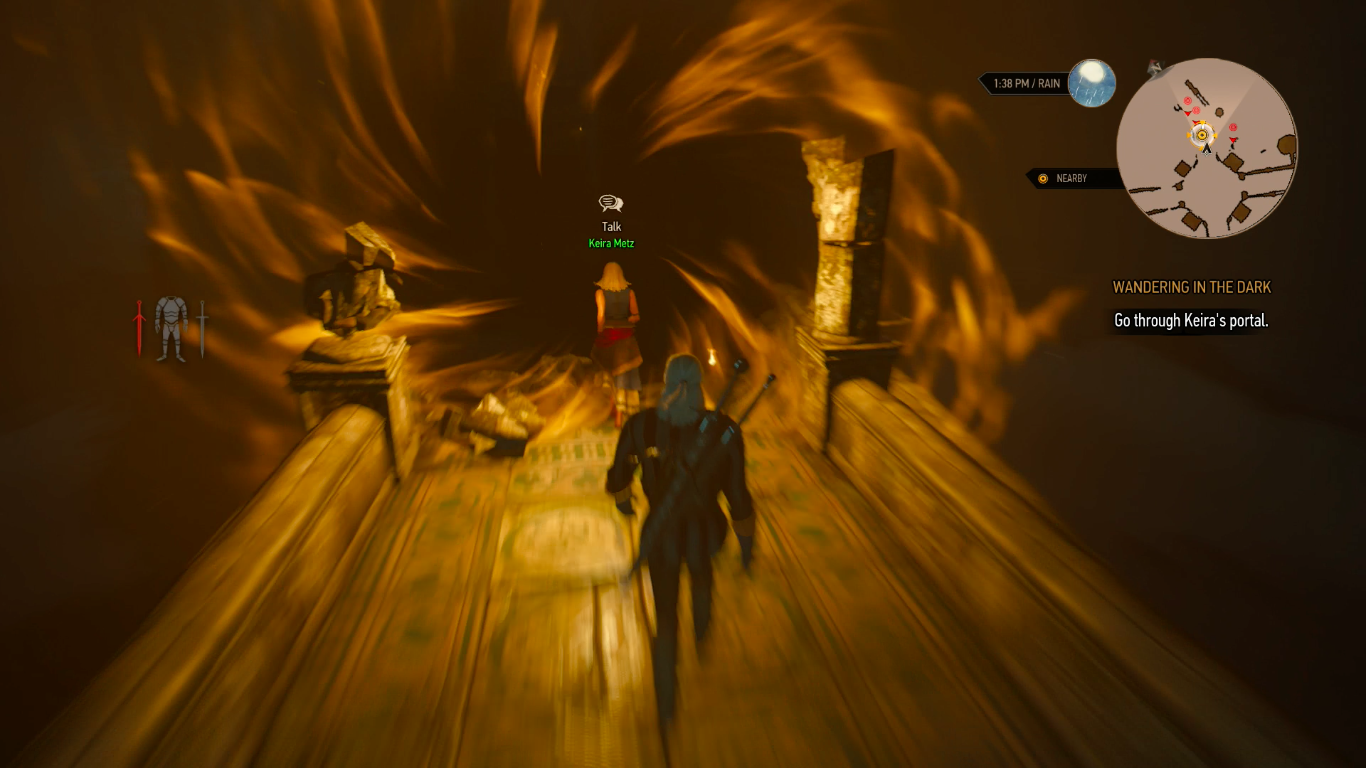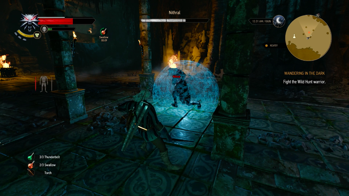 Držte se tedy u Keiry pod jejím magickým štítem, ochraňujte ji před stvůrami a postupně zavřete všechny tři trhliny, za což dostanete další zkušenosti. Sledujte Keiru dál, nechejte ji uvolnit průchod a dostaňte se do komnaty, kde vás čeká boj s členem Divokého Honu, jménem Nithral. Taktika je na něj celkem jednoduché a jde hlavně o to, jak bude využívat úhyby. Osobně se mi osvědčilo do něj 2krát seknout rychlým údery a poté uskočit. Jakmile mu takto seberete 1/3 života, tak kolem sebe vytvoří auru a vyvolá trhlinu, ze které vylezou 3 Psi Divokého Honu. Ty zlikvidujte a opět budete moci bojovat s Nithralem. Tento postup ještě jednou zopakujte a jakmile zabijete druhou várku psů, tak ho budete moci dorazit, za což budete odměněni zkušenostmi a také několika zajímavými předměty jako je nákres: Angrenský kyrys, Meč válečníka Divokého honu také pár alchymistických předmětů. Potom pokračujte na konec místnosti a shlédněte další projekci, po jejímž skončení si promluvte s Keirou. Potom použijte vaše smysly, u knihovny najdete na zemi poznámky a zároveň pak prohledejte zeď v zadní části, kde od Keiry dostanete předmět Oko Nehaleni. Ten použijte na zeď a zrušte tak iluzi.