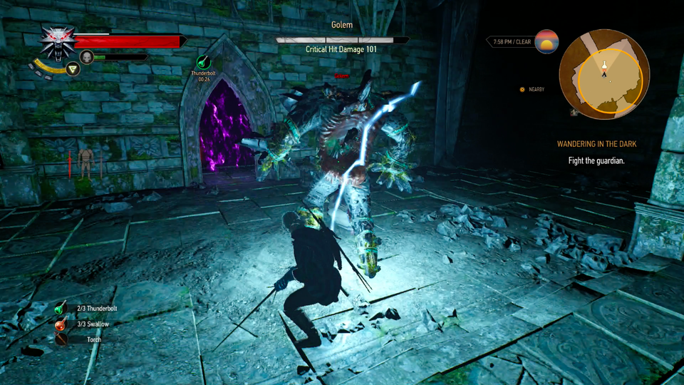 Poté si všimněte zatopeného prostoru ve středu místnosti, kam se dostanete skokem přes zábradlí. Následně se ponořte pod hladinu, doplavte vodním tunelem na konec a vynořte se ven. Vylezte nahoru do chodby, na stěně si povšimněte kresby koně a prozkoumejte ji. Poté se chodbou napravo vraťte do místnosti s Keirou, kde se otevřou dříve zavřené dveře. Doběhněte do zavřené místnosti, vedle namalovaných dveří aktivujte symbol vlaštovky a projděte průchodem až do místnosti s golemem. Na něj je nejlepší použít lektvar hrom, dostat se mu do zad a neustále používat znamení axie, které ho zmate. Jakmile mu budete za zády, tak mu sekejte do zad rychlými útoky a nakonec se vám ho podaří skolit. Prohledejte jeho ostatky, seberte všechny předměty, které u něj naleznete a vzadu vylezte na vyvýšenou část. Doběhněte na rozcestí, dejte se doleva a po prozkoumání dalšího symbolu vlaštovky projděte portálem. Následně projděte kolem zmrzlých strážců až do další části, kde opět uvidíte Divoký Hon, který vám do cesty naklade překážky.